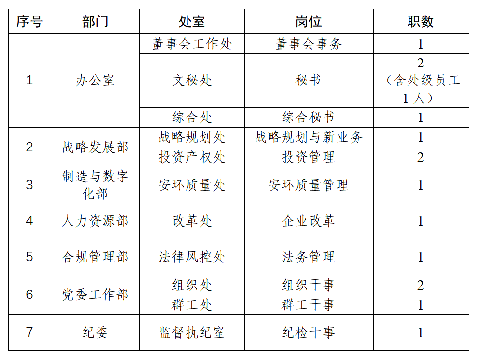 3.员工岗位要求1986年1月1日以后出生(纪委、党委巡察办、综合秘书岗位可放宽至1981年1月1日)。本科学历人员内部累计工作年限三年(以自然年计算)及以上,全日制研究生及以上学历人员累计工作年限1年及以上,特别优秀者可适当放宽;处级员工岗位要求1982年1月1日以后出生,公司内部累计工作五年(以自然年计算)及以上,特别优秀者可适当放宽。